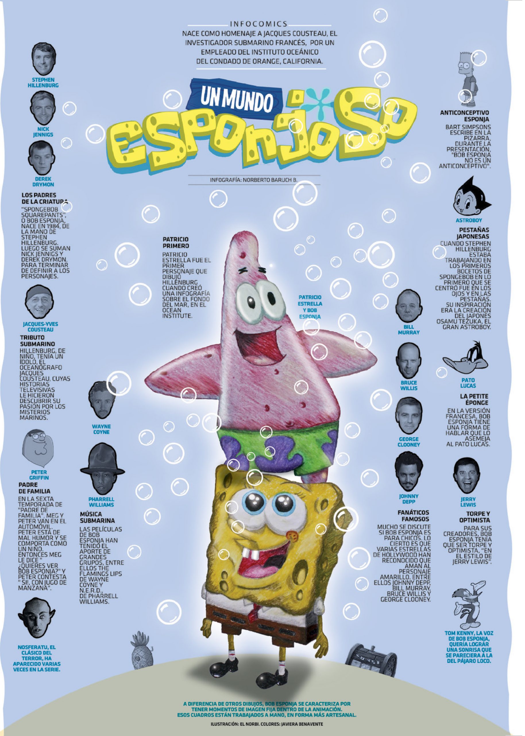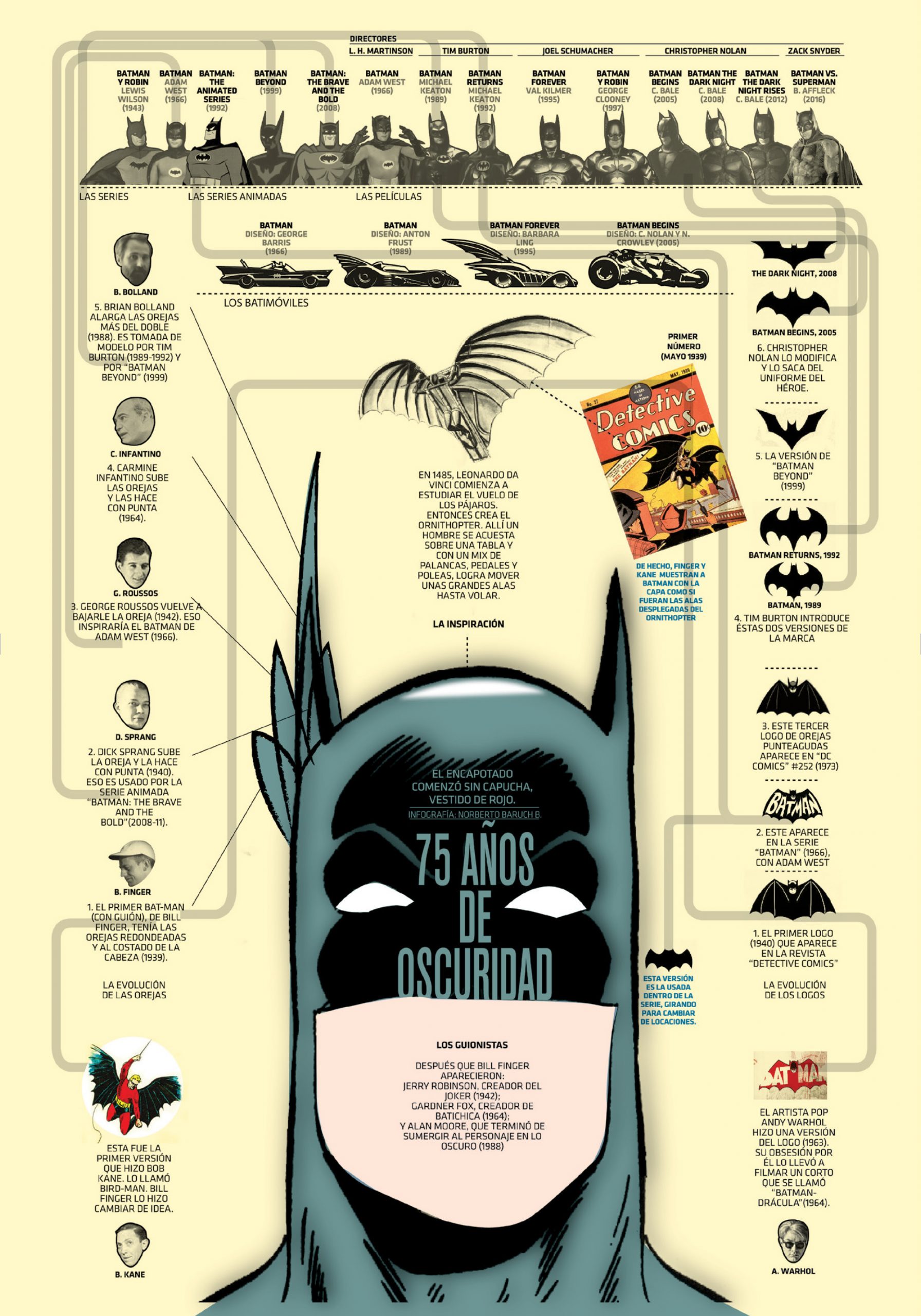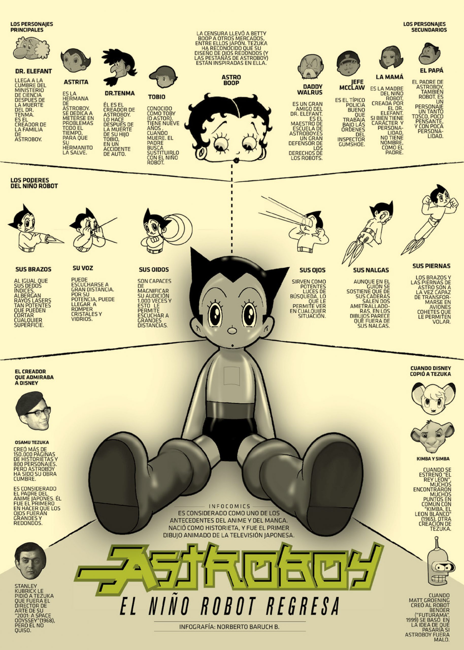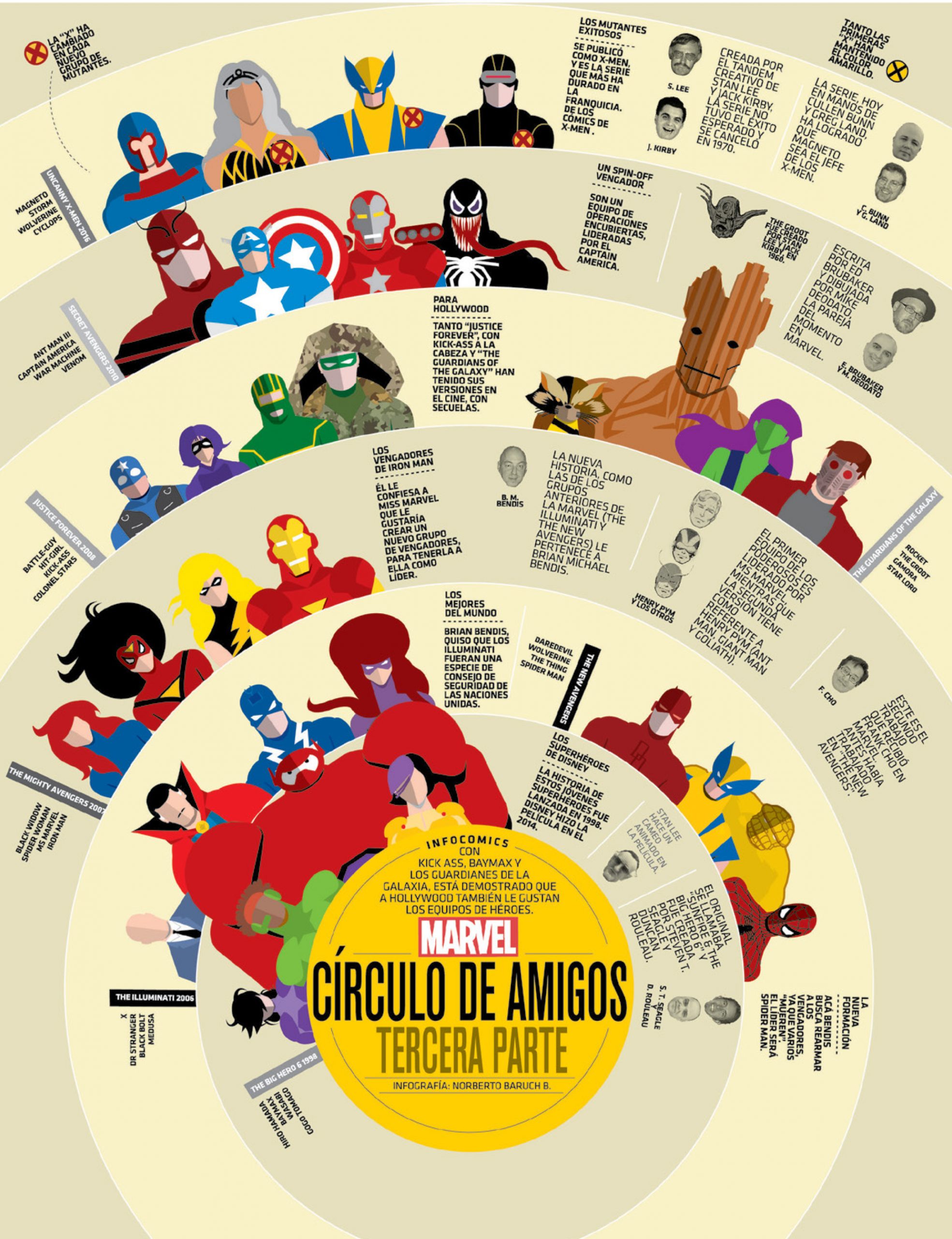 En estas alucinantes infografías; llenas de ilustraciones, de muy diferentes estilos de diseño, y de datos e informaciones anecdóticas, curiosas e históricas; descubriremos secretos que esconden nuestros personajes más queridos y admirados. Aquellos que nos han marcado, los que han revolucionado el mundo, lo que han marcado un hito e incluso, algunos que habrán pasado por nuestras vidas sin pena ni gloria o que, simplemente, no conocíamos, pero que ahora van a captar totalmente nuestra atención, porque las composiciones de Norberto Baruch no dejan indiferente.