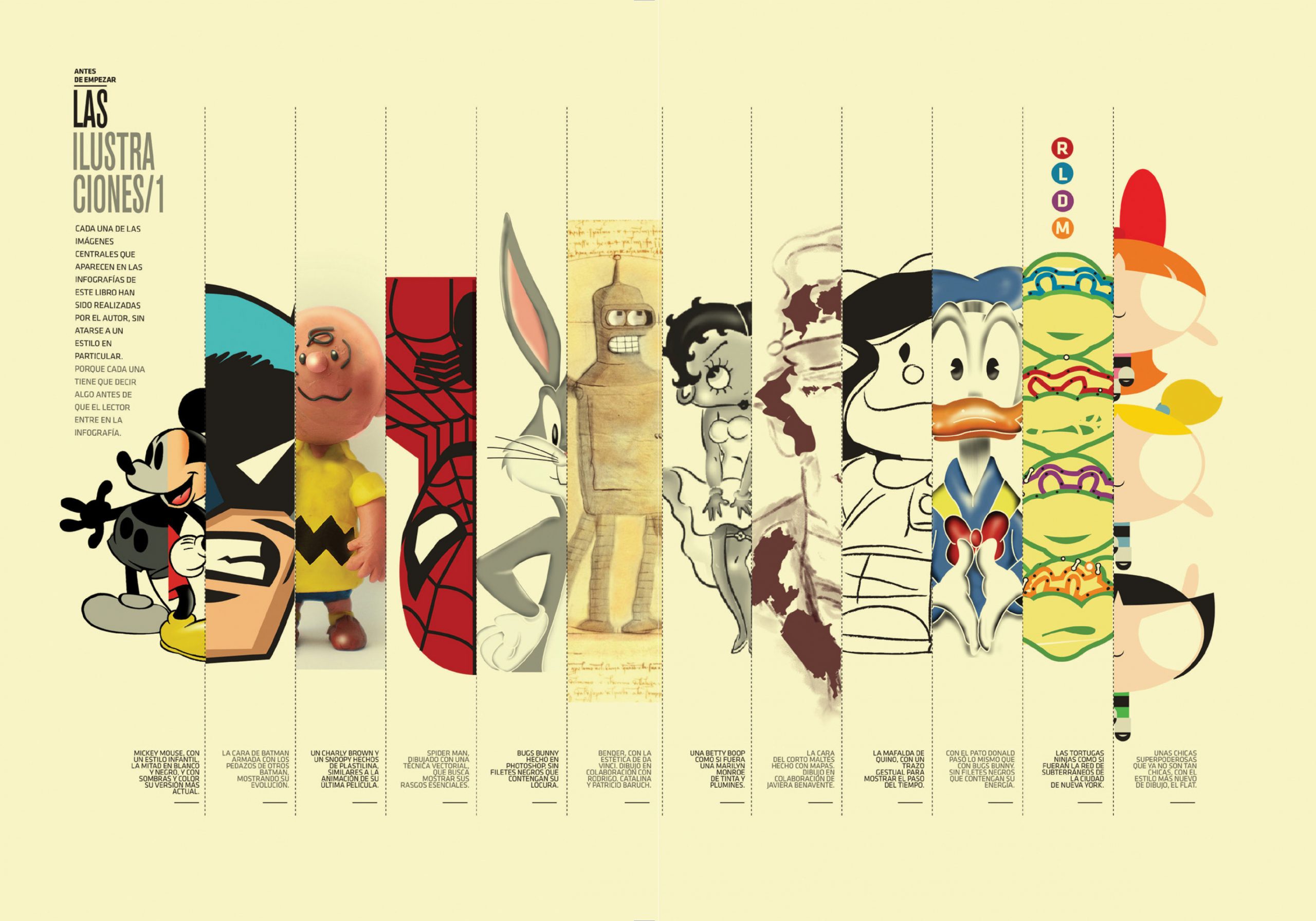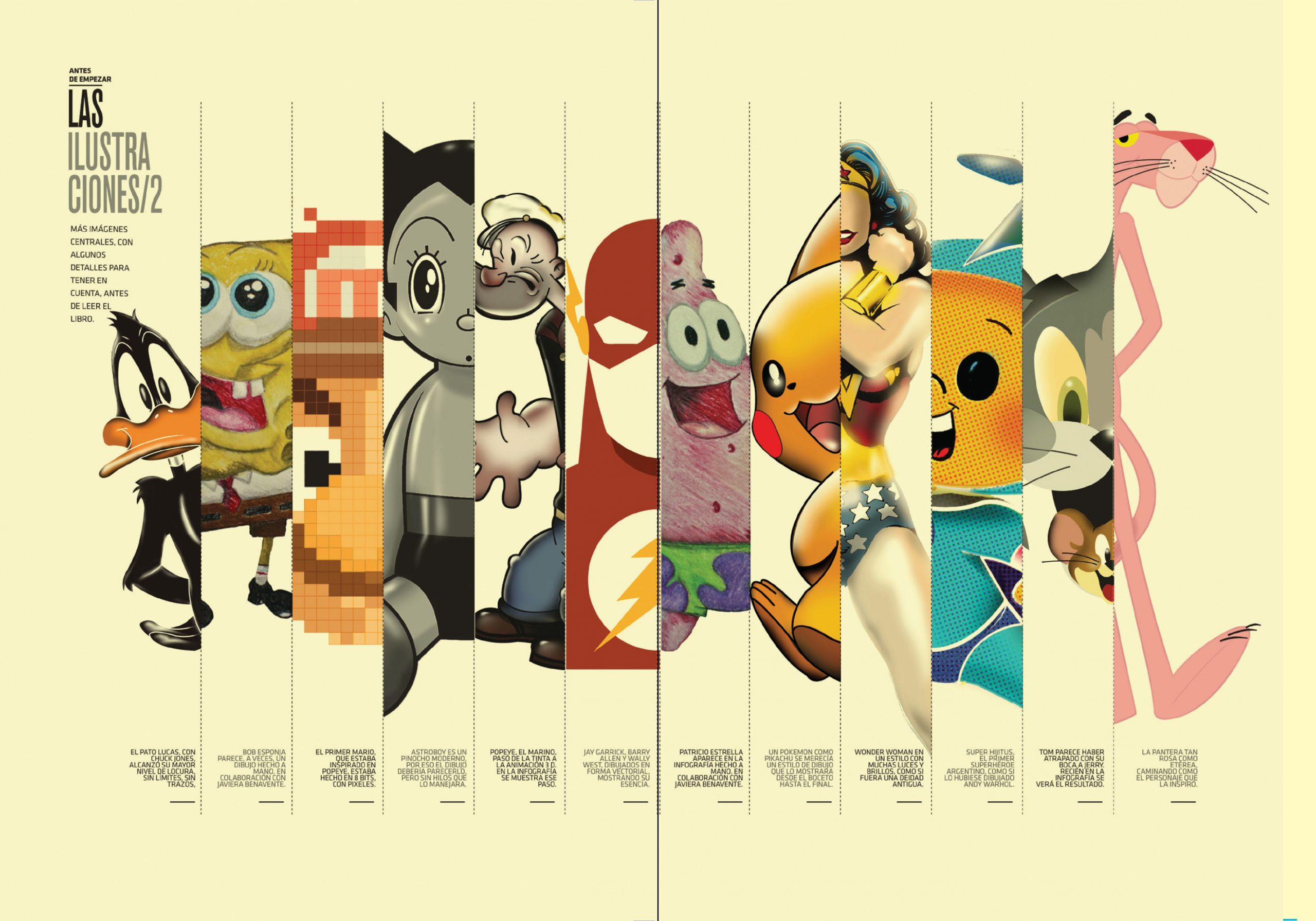 Entre estas páginas conoceremos la evolución del diseño de personajes, imágenes y logos, cómo y por qué surgieron algunos de ellos; cómo se relacionan unos con otros (algunos sorprenden muchísimo como la relación que tienen Popeye con Super Mario o Goku con el hombre de acero); su función aleccionadora, didáctica y propagandística; la relación entre amigos, grupos, villanos, influencias, inspiraciones, etc… Todo un entramado que perfila el autor de forma magistral para dejarnos una imagen clara de un universo intrincado y enormemente complejo.