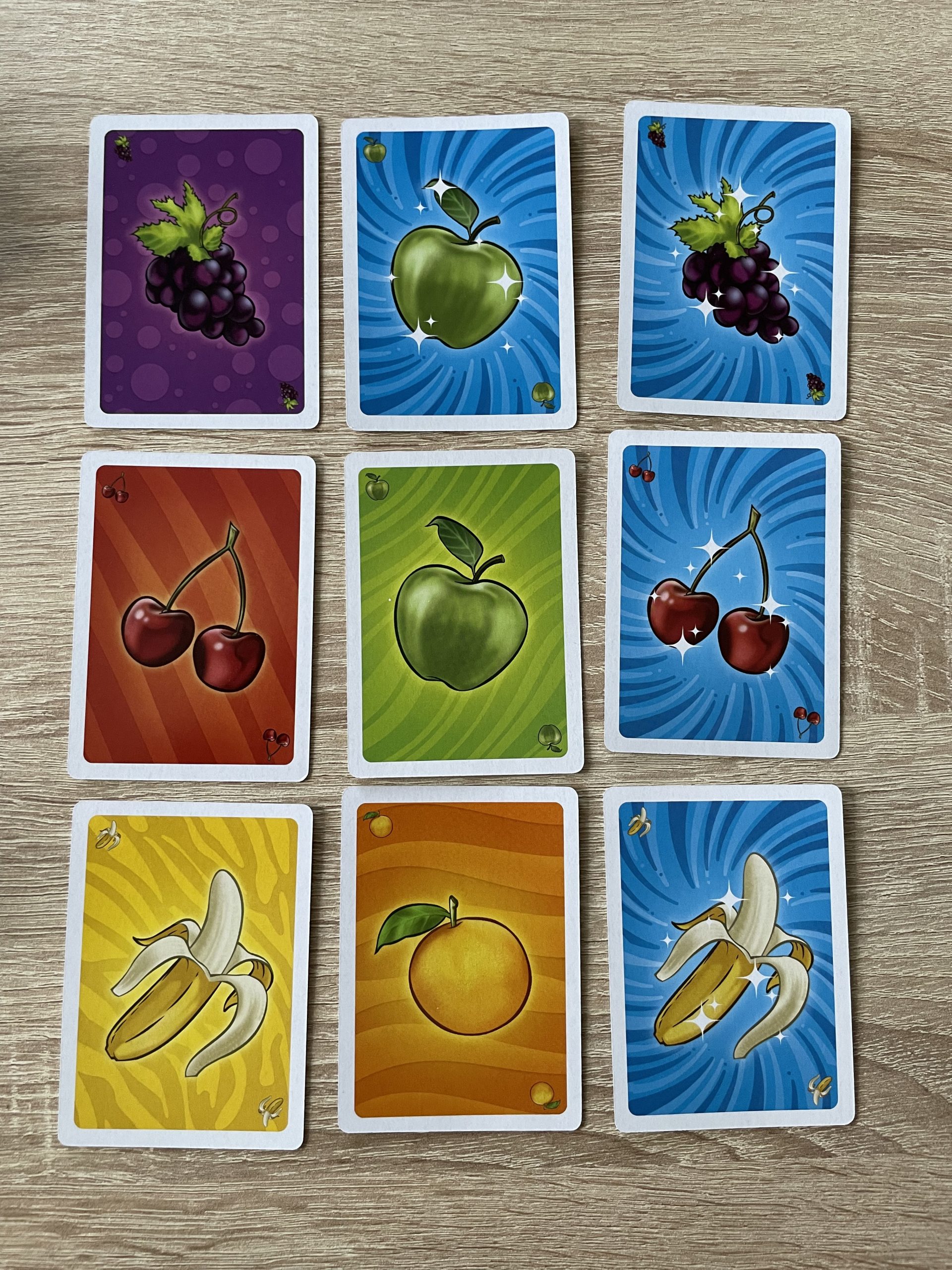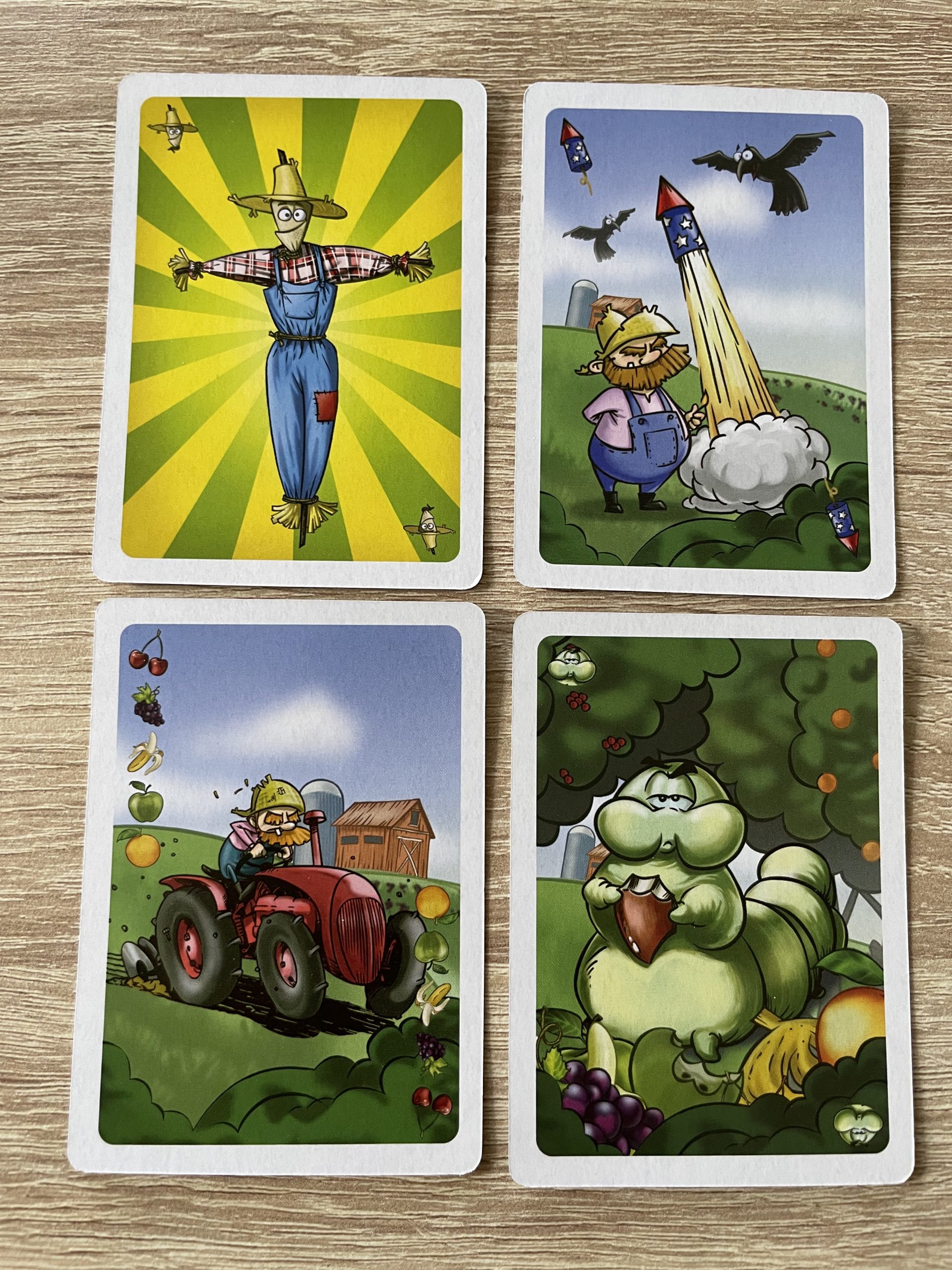 Como decíamos al principio nuestra misión es tirar diferentes cartas de fruta pero en cada turno siempre tendremos que tirar del mismo tipo, a no ser qué tengamos la carta de tractor, además a las cartas con un pajarraco encima no le podremos añadir mas fruta de la misma familia hasta quitárlo con el espantapájaros